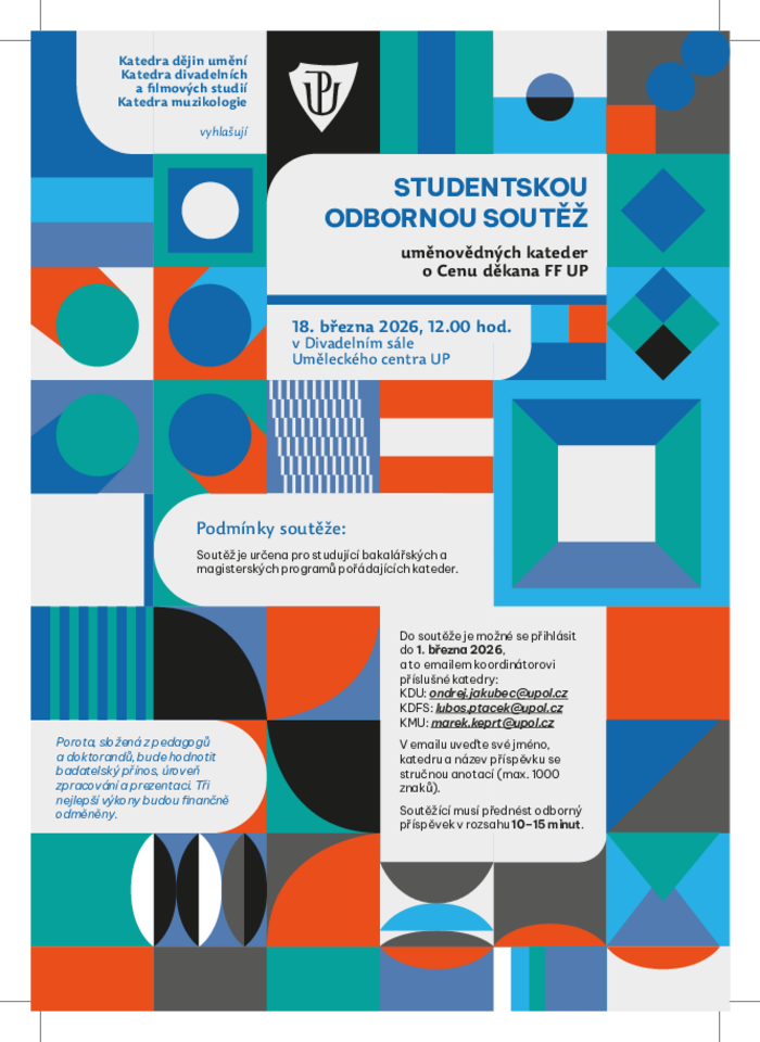 Zveme Vás na studentskou odbornou soutěž uměnovedných kateder, která se uskuteční 18. března 2026 ve 12:00 v Divadelním sále Uměleckého centra UP. Více informací zde.